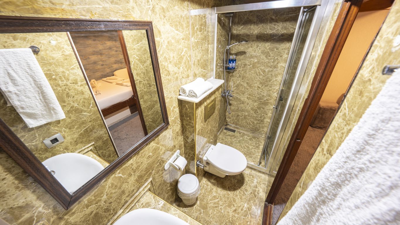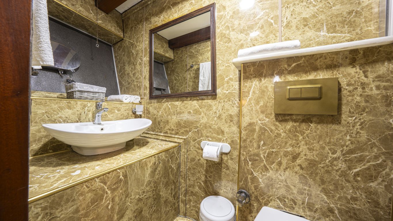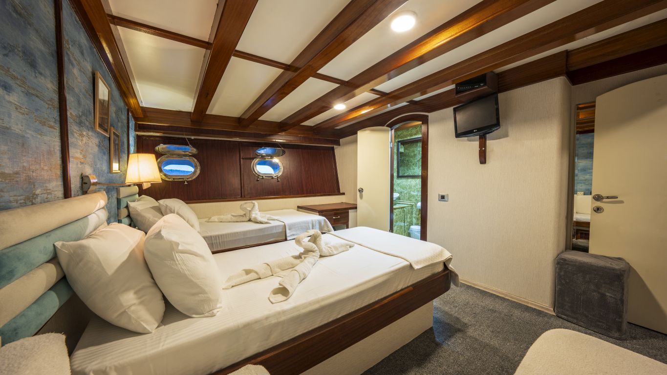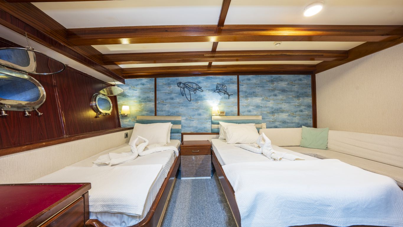 | 24 kişilik; 6 Double Kabin, 6 Twin Kabin, klimalı, duş ve tuvaletli kamara. Kaptan ve mürettebat için ayrı kabinler. |