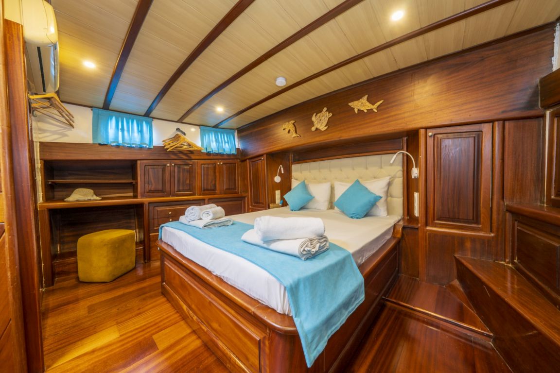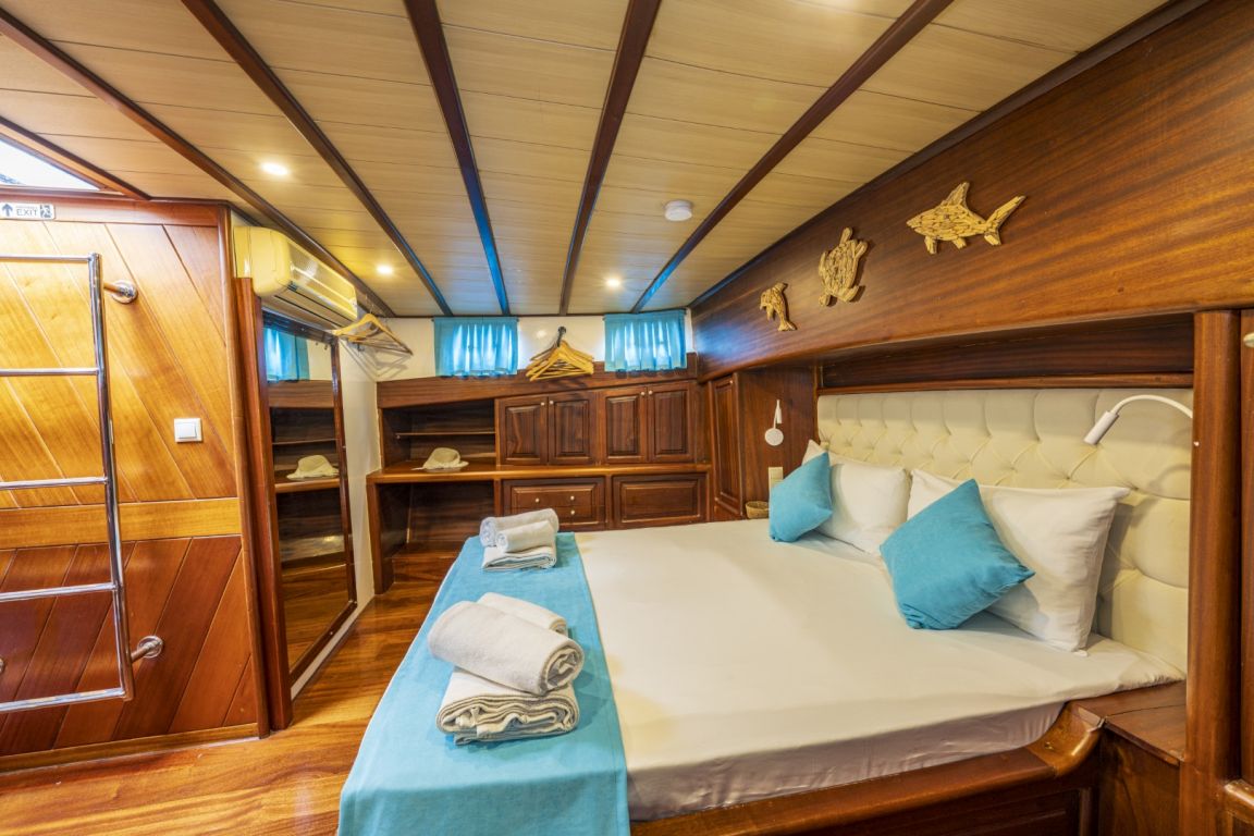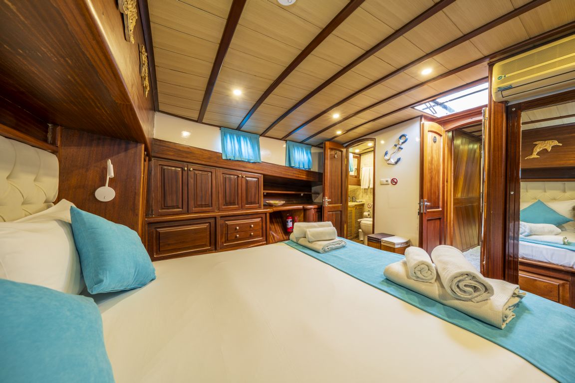 6 kişiye kadar konaklama kapasitesi; 1 ana kamara, 2 çift kişilik kabin, tüm kabinlerde klima, duş kabini ve ev tipi tuvaletler, ayrı mürettebat kabinleri. |