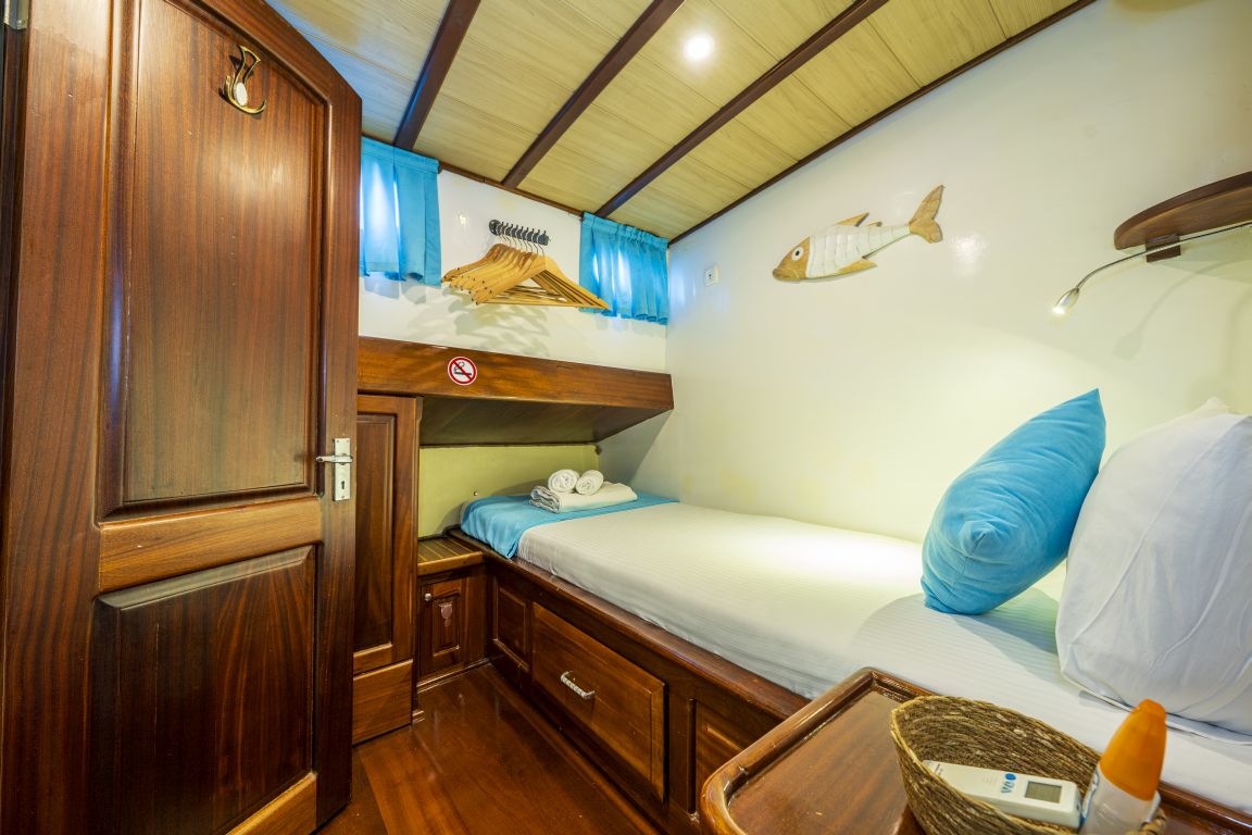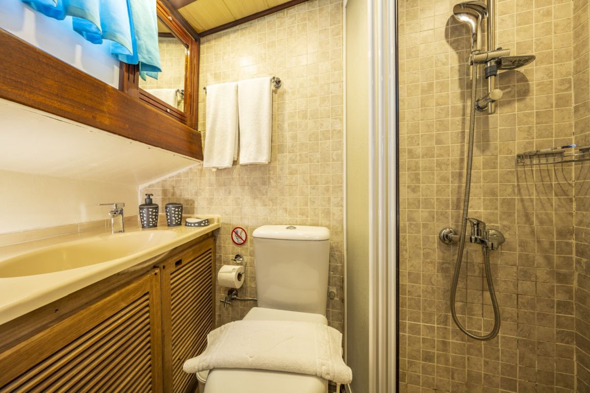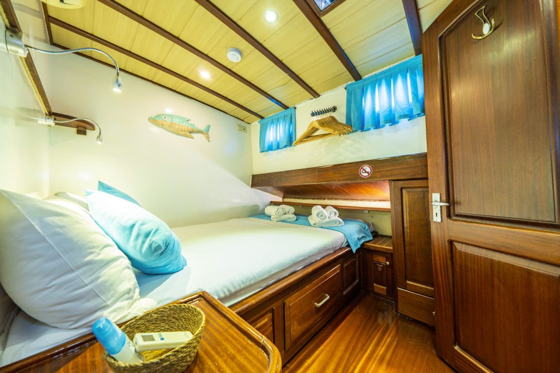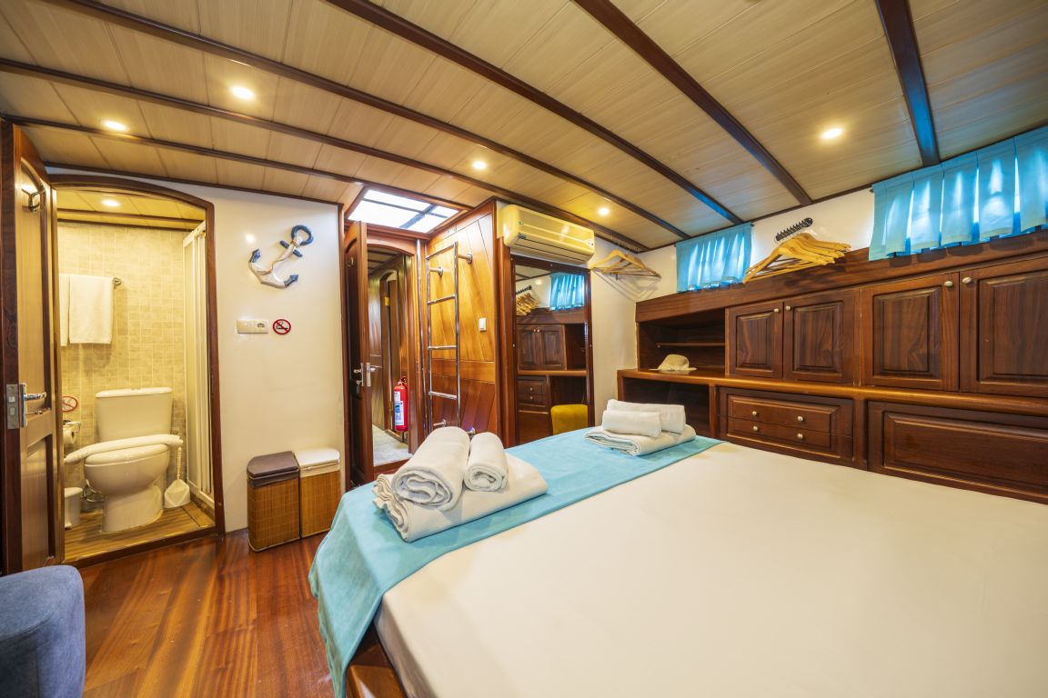 6 kişiye kadar konaklama kapasitesi; 1 ana kamara, 2 çift kişilik kabin, tüm kabinlerde klima, duş kabini ve ev tipi tuvaletler, ayrı mürettebat kabinleri. |