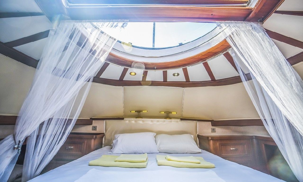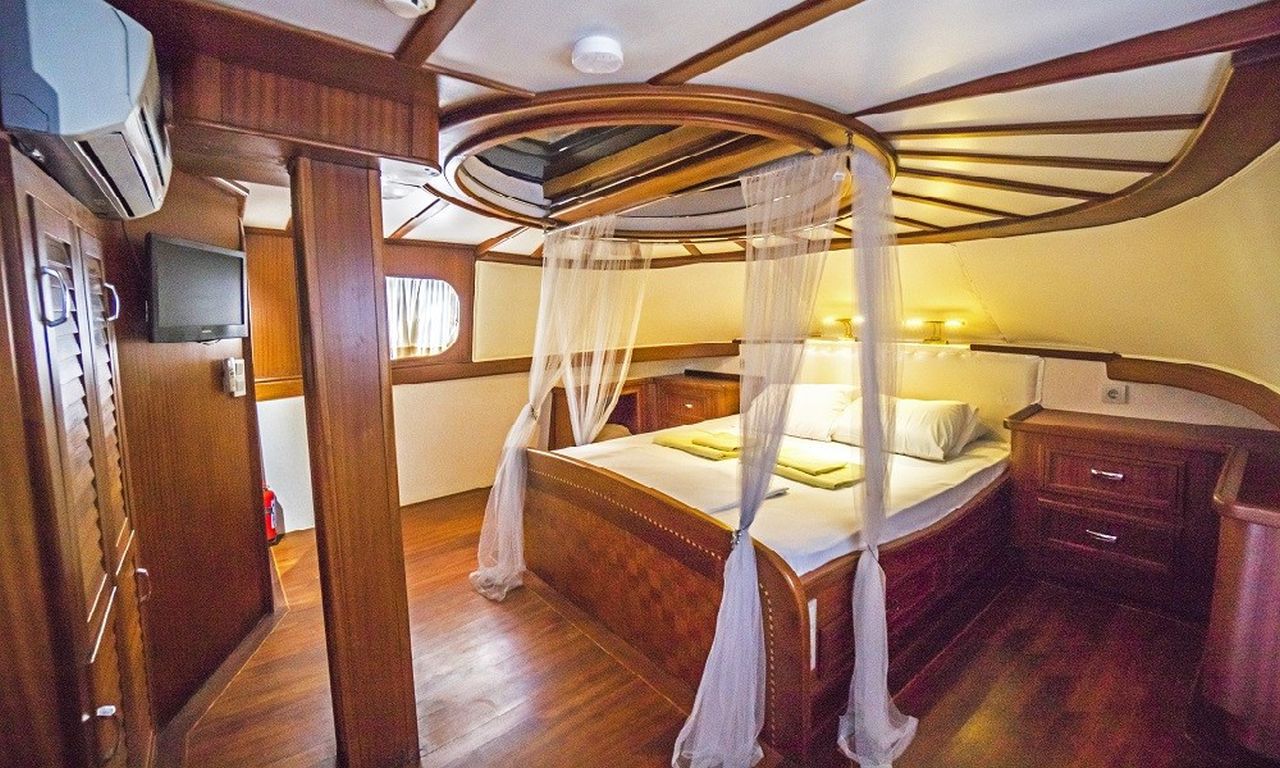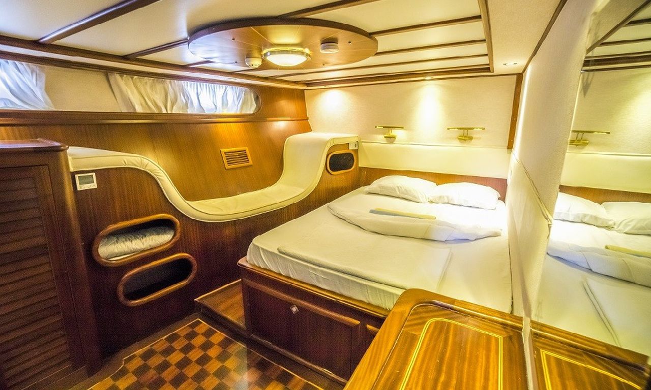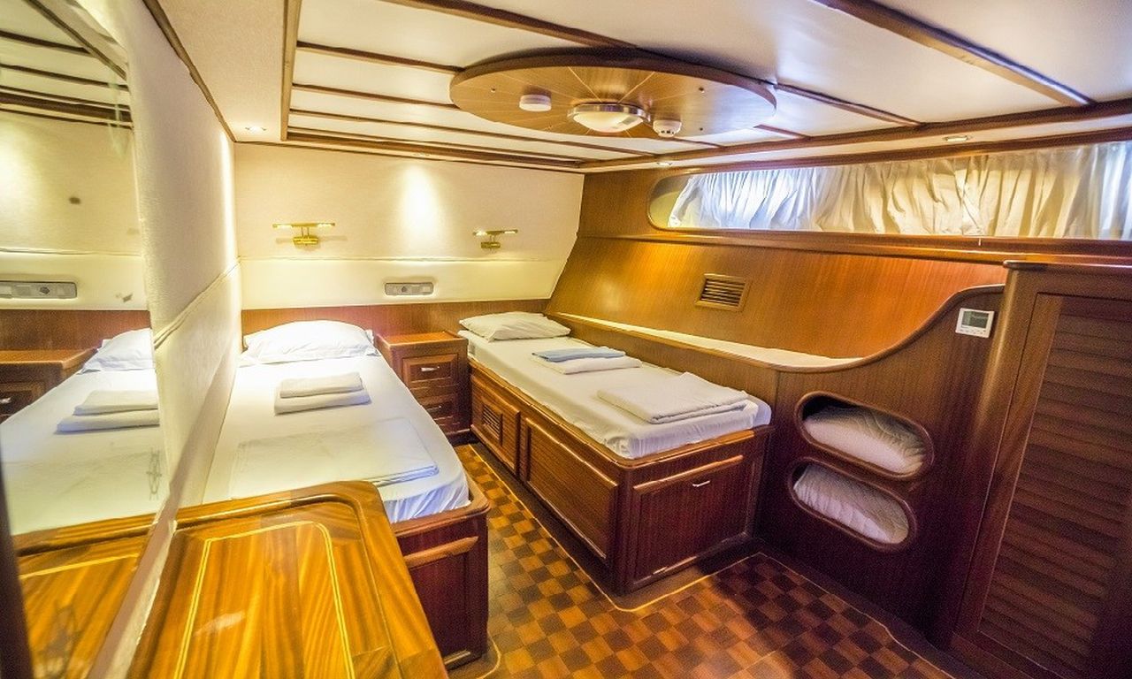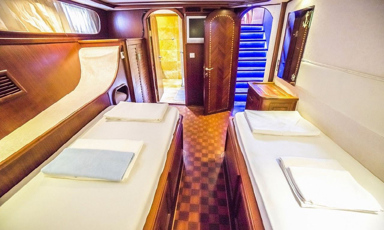 8 Kişilik Misafir Kapasitesi; 2 Master, 1 Çift Kişilik, 1 ikiz Kabin, Tüm kabinlerde A/C, duşakabin ve ev tipi tuvaletler, ayrı mürettebat kabinleri. |