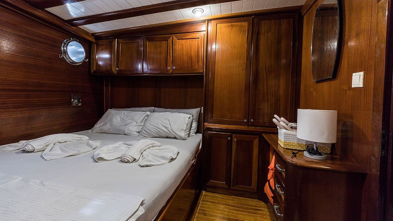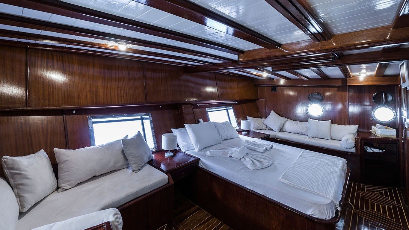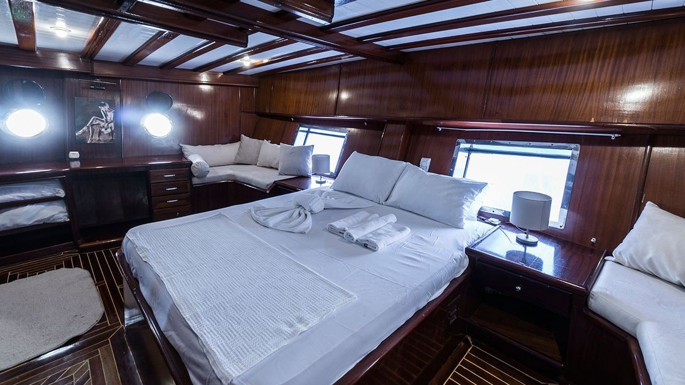 8 Kişilik Misafir Kapasitesi; 2 Master, 2 Double Kabin, tüm kabinlerde duş kabini ve tuvalet, ayrı mürettebat kabinleri. |