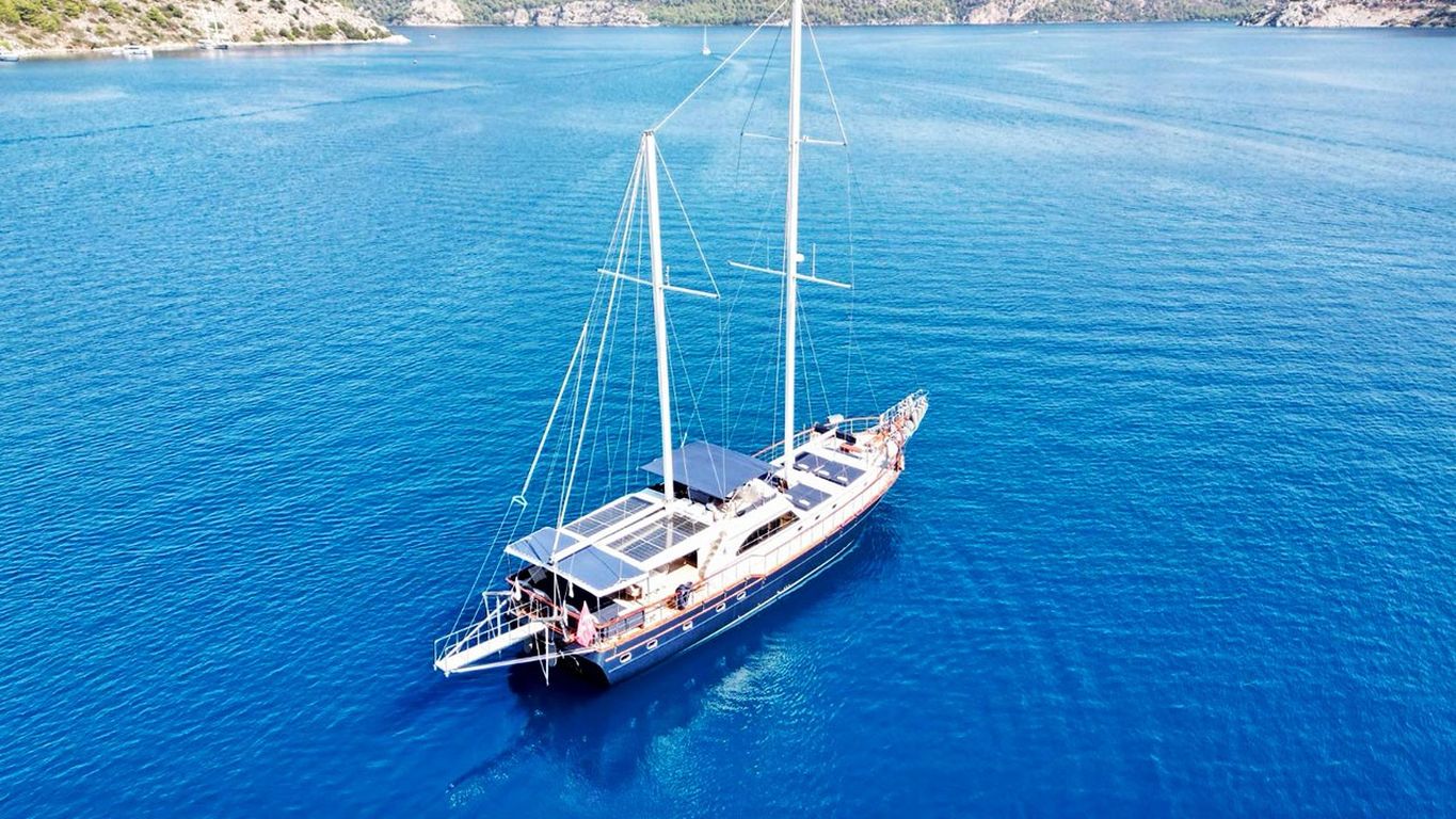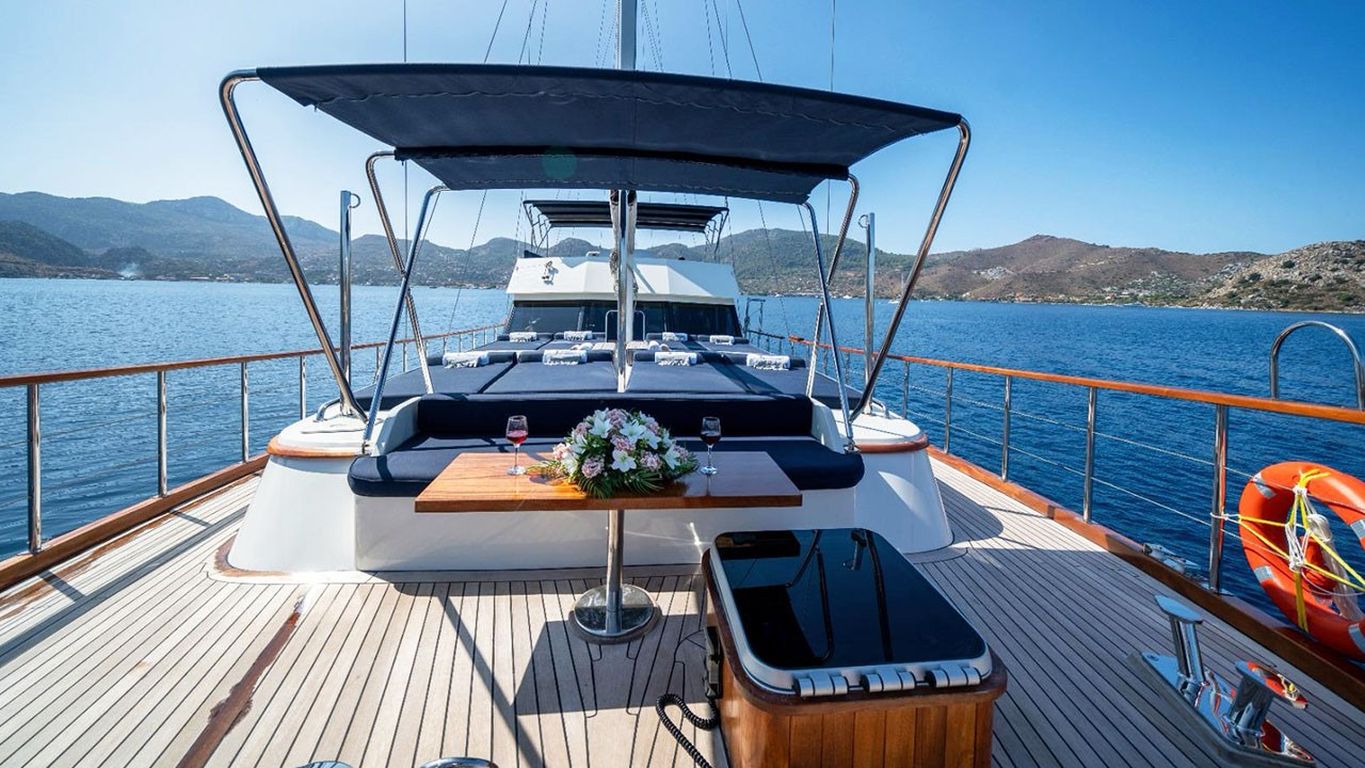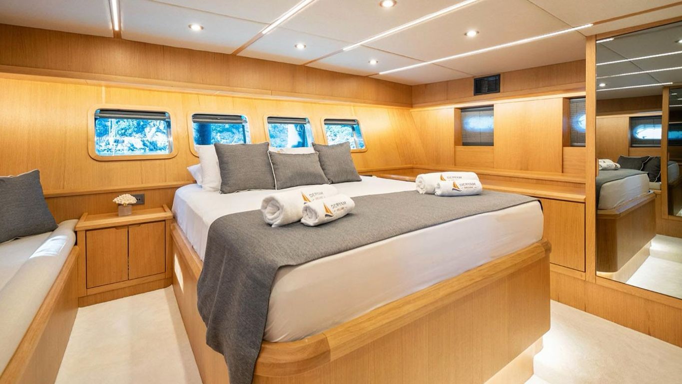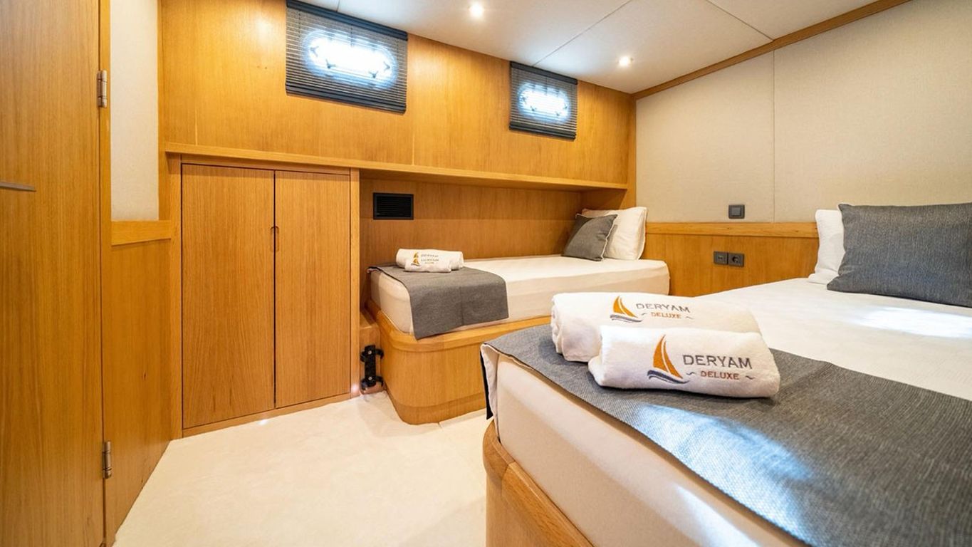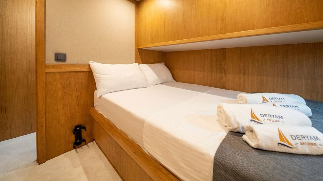 | Deryam Delux Bodrum, Gökova, Marmaris, Göcek, Fethiye turlarımızda en çok tercih edilen küçük gruplar ve aileler için ideal 10 kişi kapasiteli 5 kabinli teknelerimizden biridir. Guletimiz özel tekne kiralamada misafirlerine Bodrum Göcek Fethiye Marmaris çıkışlı unutulmaz bir mavi tur tatili yaşatmak için özel olarak tasarlanmıştır. 23.95 mt Uzunluğundaki guletimiz 2023 yılında imal edilmiştir. Bu 5 kabinli guletimizde evinizin bütün konforunu deniz üzerinde yaşayabilirsiniz. Deryam Delux guleti toplam 5 çift kişilik yataklı kabiniyle, toplamda 10 misafir için konaklama imkanı sunar. Guletimizin kabinlerinde konforlu duş ve wc imkanı vardır. Guletimizin iç ve dış mekanlarında, salonda, güvertede ve mutfağında son derece kaliteli materyaller kullanılarak zevkle dekore edilmiştir. Yatının mavi tur servisi konusunda deneyimli Kaptan ve aşçısı tekne tatiliniz boyunca konforunuz için sizin hizmetinizdedir. 4 kişilik ekibiniz servis, yemek, temizlik ve günlük faaliyetlerin organizasyonu için tatiliniz boyunca size eşlik edecektir. guletimiz ile yapmış olduğumuz kiralamalarda müşterilerimizden. Son yıllarda aldığımız Geri dönüş ve referanslar Deryam Delux yatımızda yüzde yüz müşteri memnuniyeti garantisi vermektedir. |