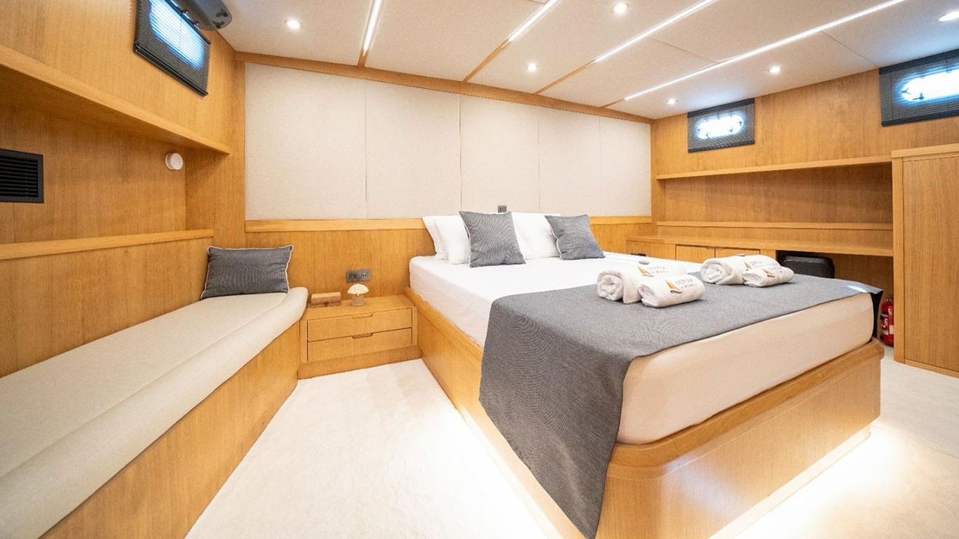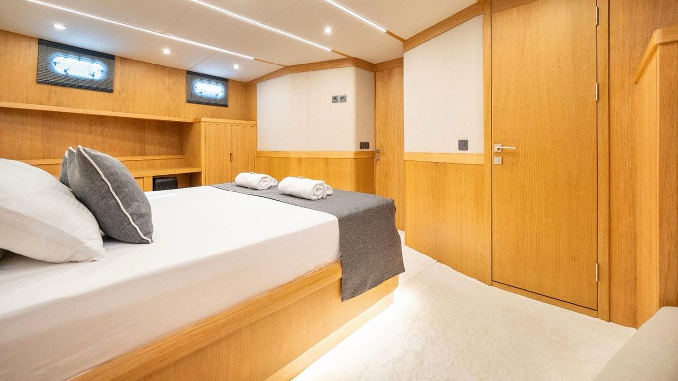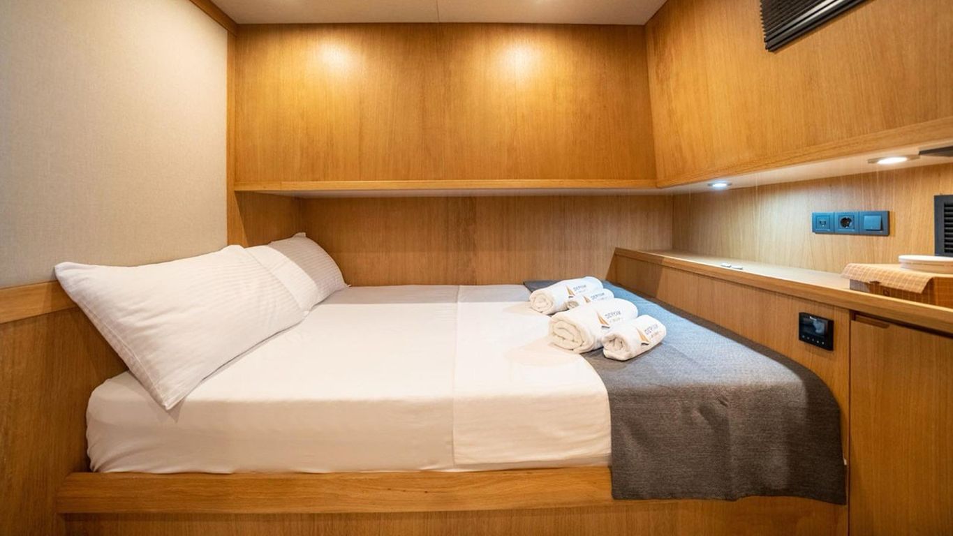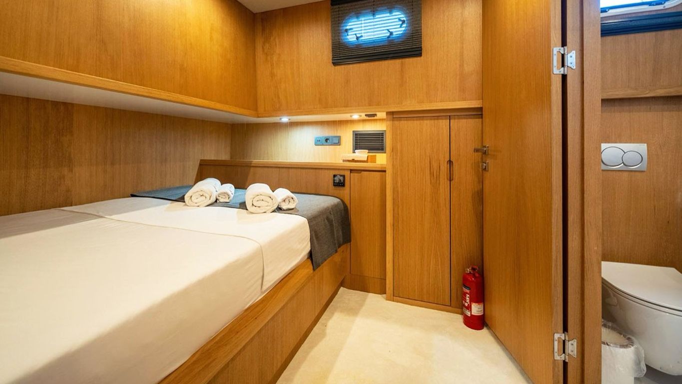 10 Kişiye Kadar Kapasite; 2 Master, 1 Double, 2 Twin Kabin, tüm kabinlerde duş kabini ve tuvalet, ayrı mürettebat kabinleri. |