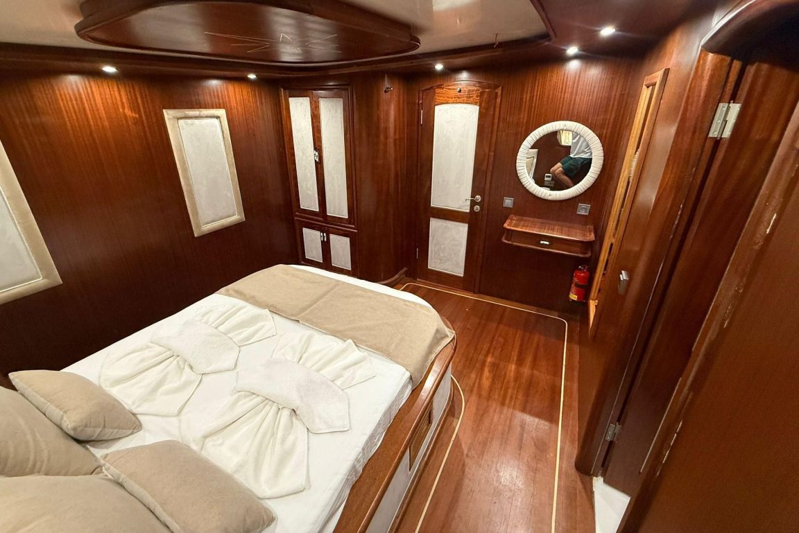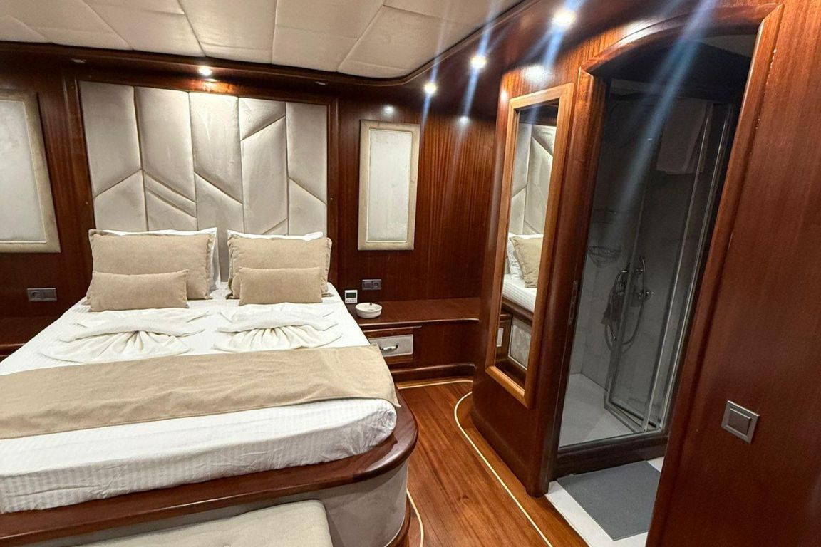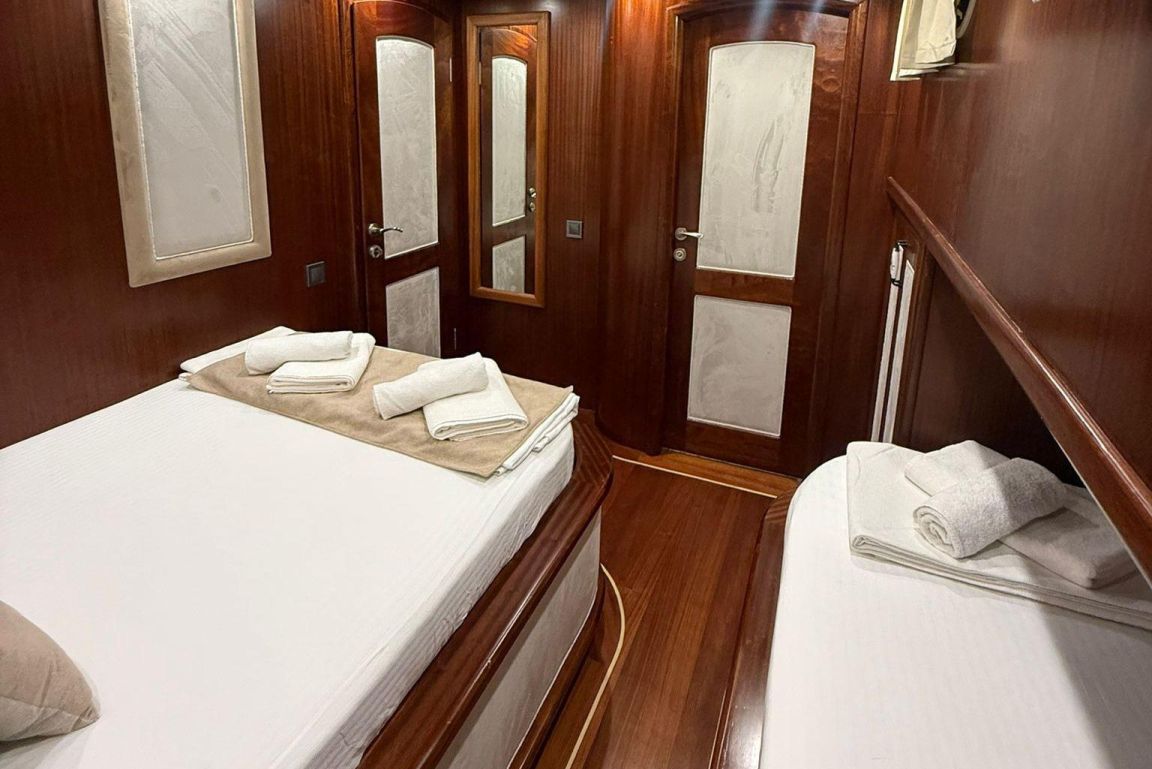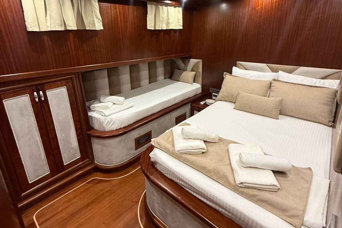 12 Kişiye Kadar Kapasite; 2 Master, 1 Double, 2 Triple Kabin, tüm kabinlerde duş kabini ve tuvalet, ayrı mürettebat kabinleri. |