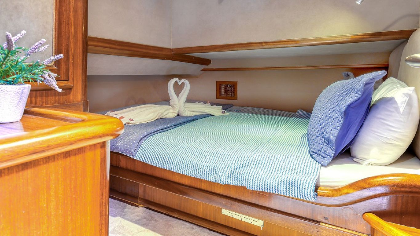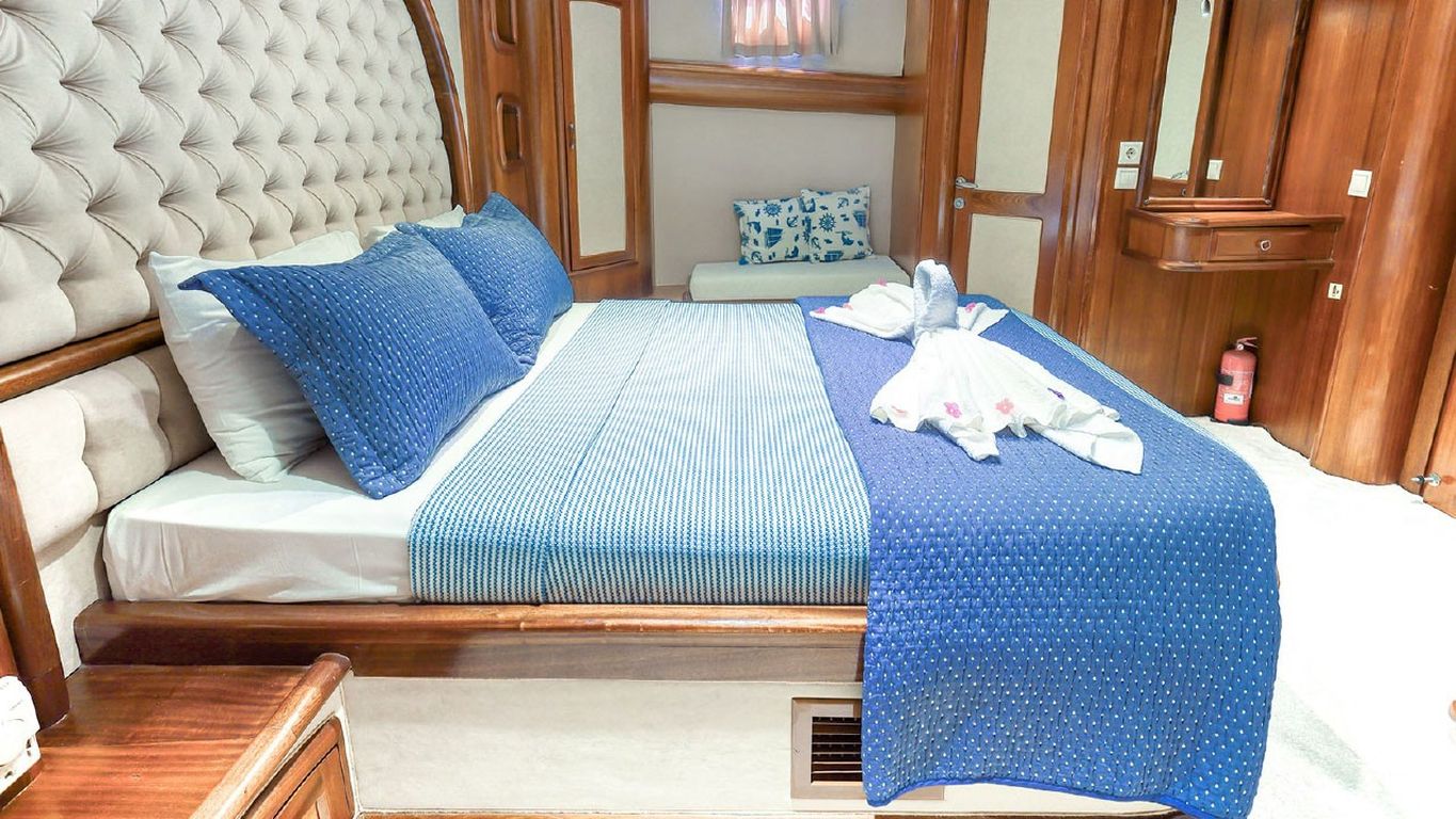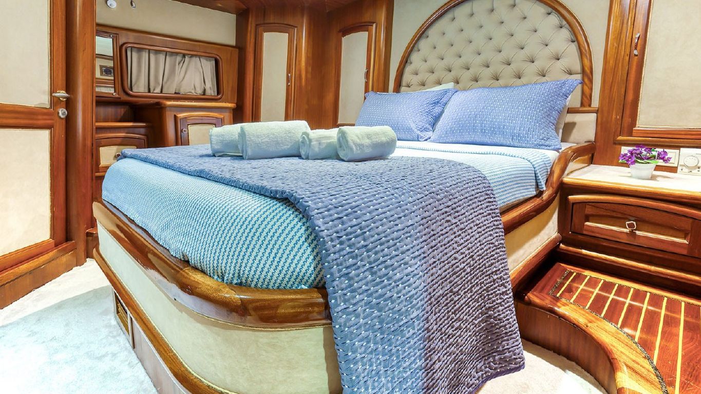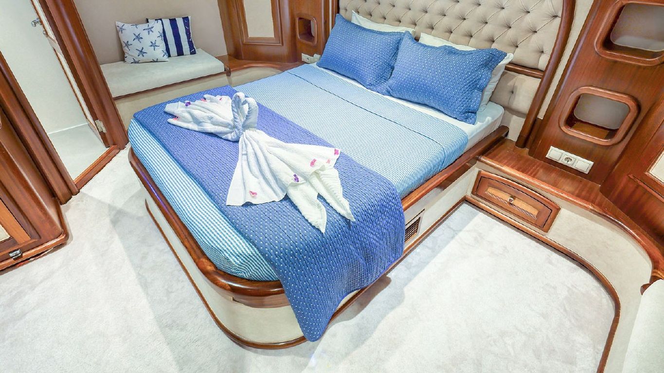 10 Kişiye Kadar Kapasite; 2 Master, 3 Double Kabin, tüm kabinlerde duş kabini ve tuvalet, ayrı mürettebat kabinleri. |