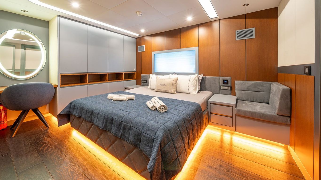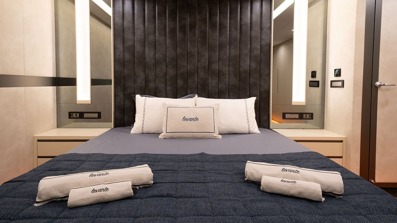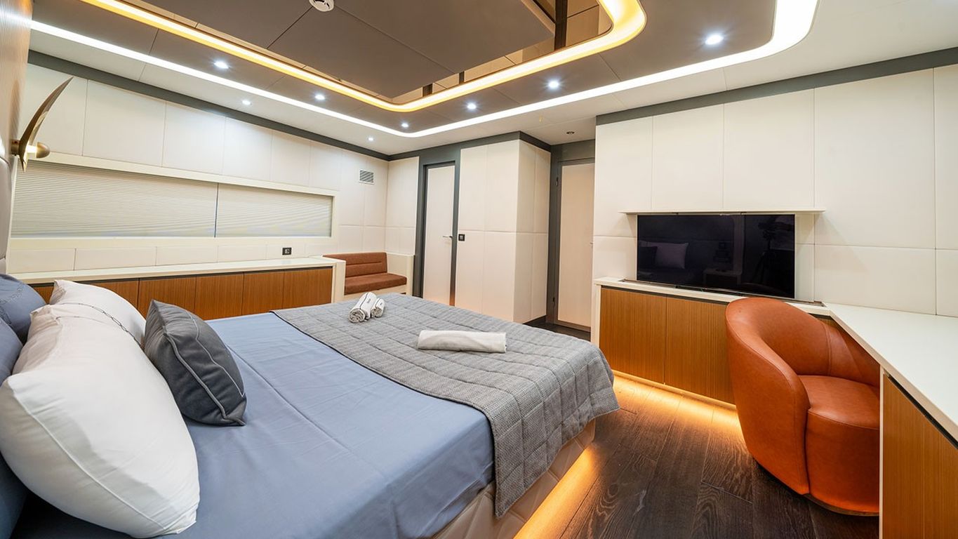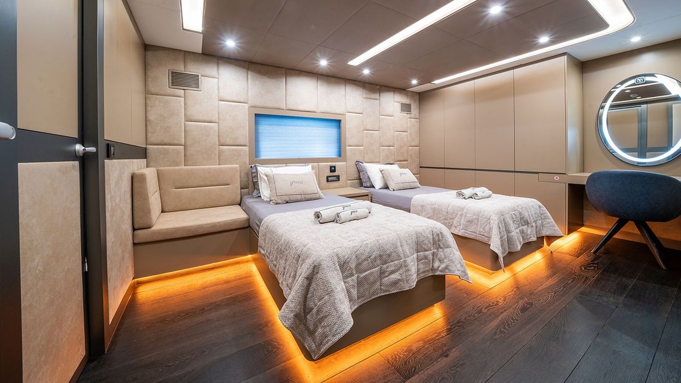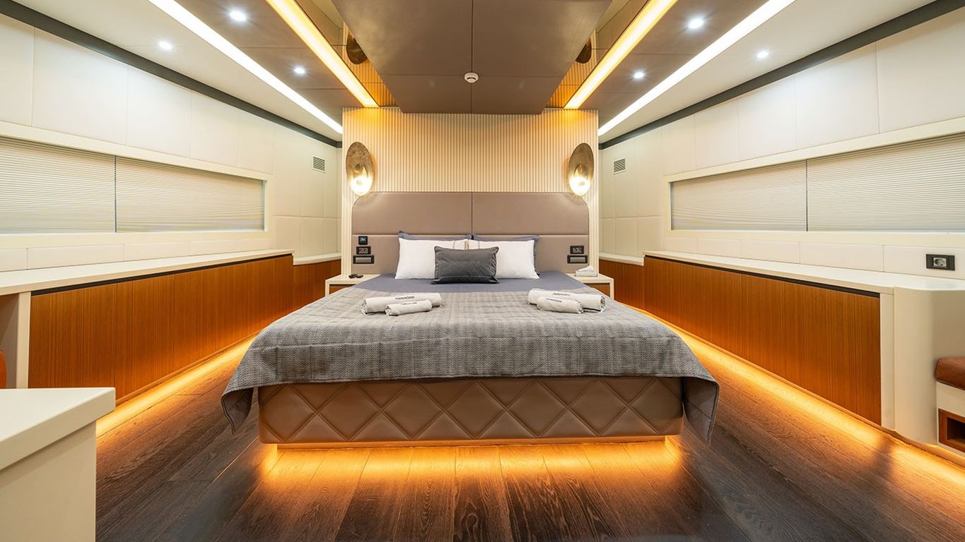 10 Misafir Kapasitesi; 1 Master, 3 Double, 1 Twin Kabin, tüm kabinlerde duş kabini ve tuvalet, ayrı mürettebat kabinleri.. |