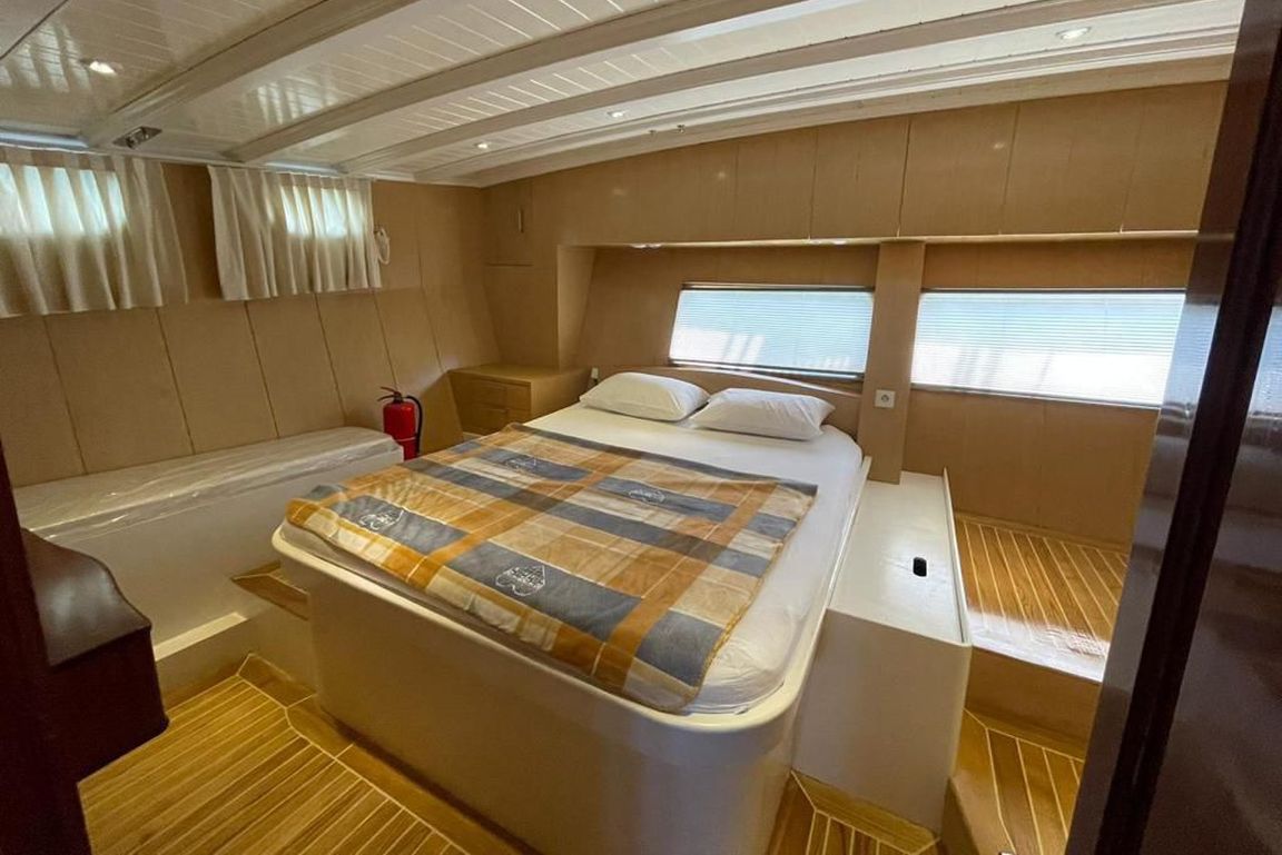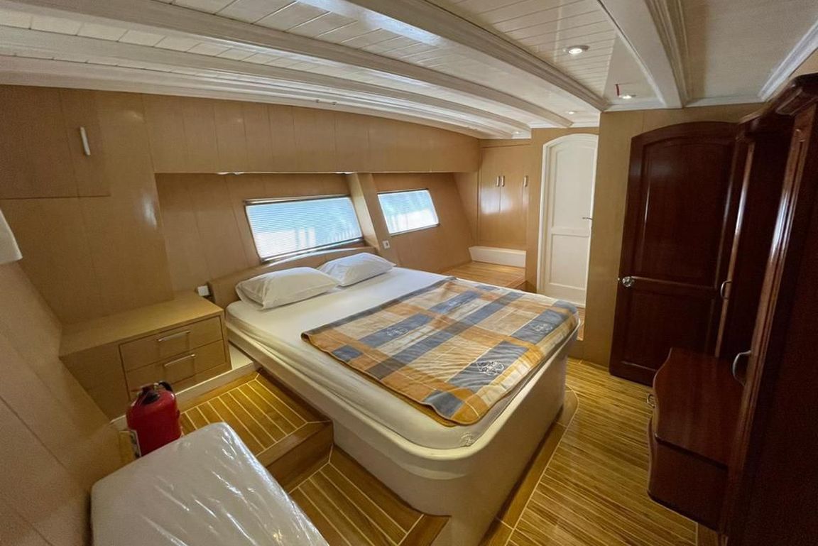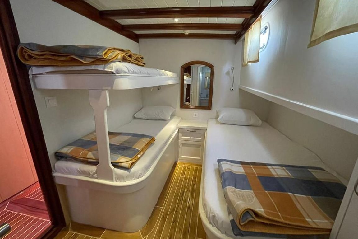 12 kişiye kadar konaklama; 3 çift kişilik, 2 iki yataklı kabin, klima, duş, havlu askısı, sıcak su, tuvalet, saç kurutma makinesi, nevresimler, yastık ve kılıflar, çekmece, gardırop, ısıtma, ayrı mürettebat kabinleri. |