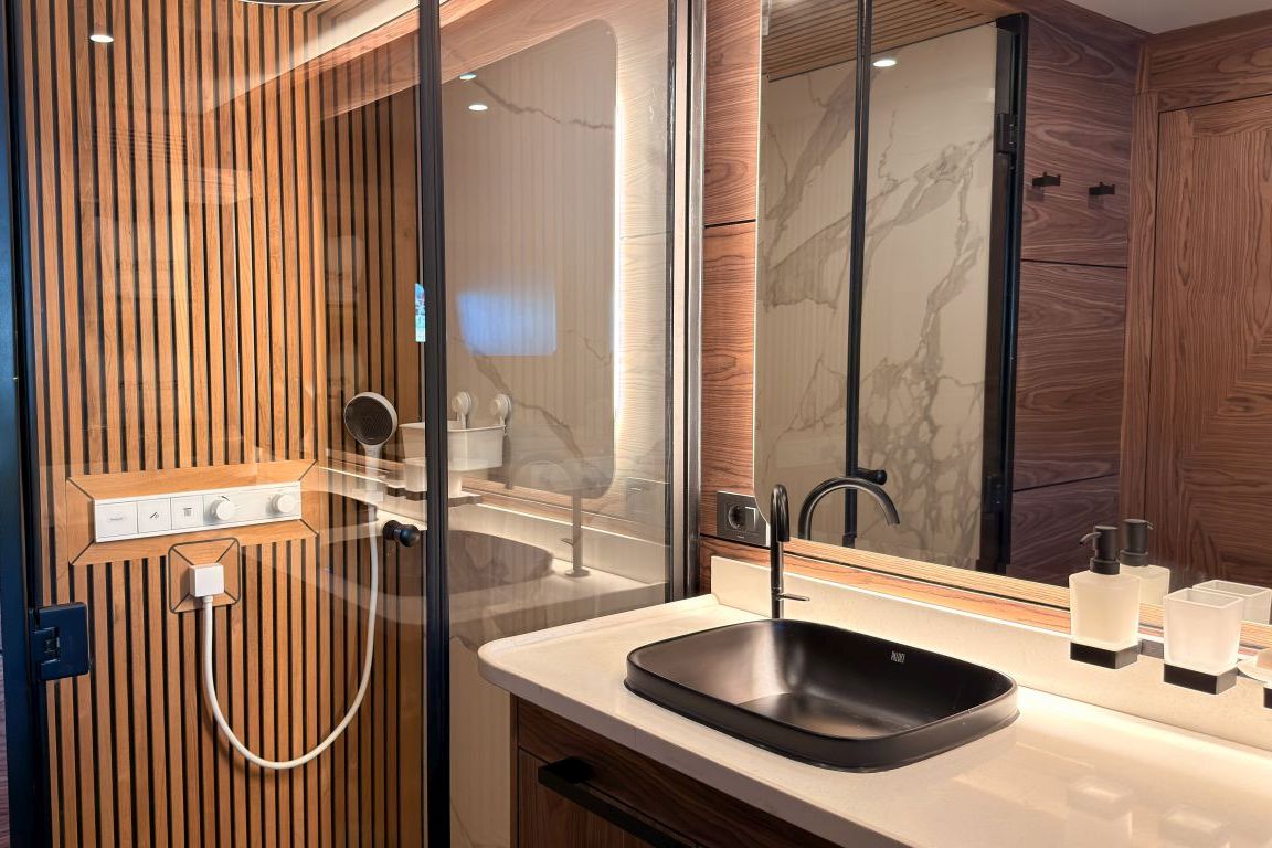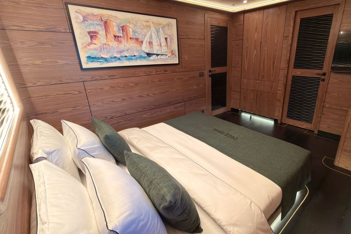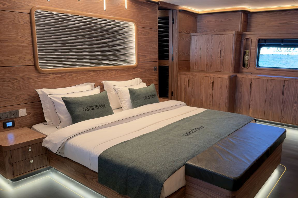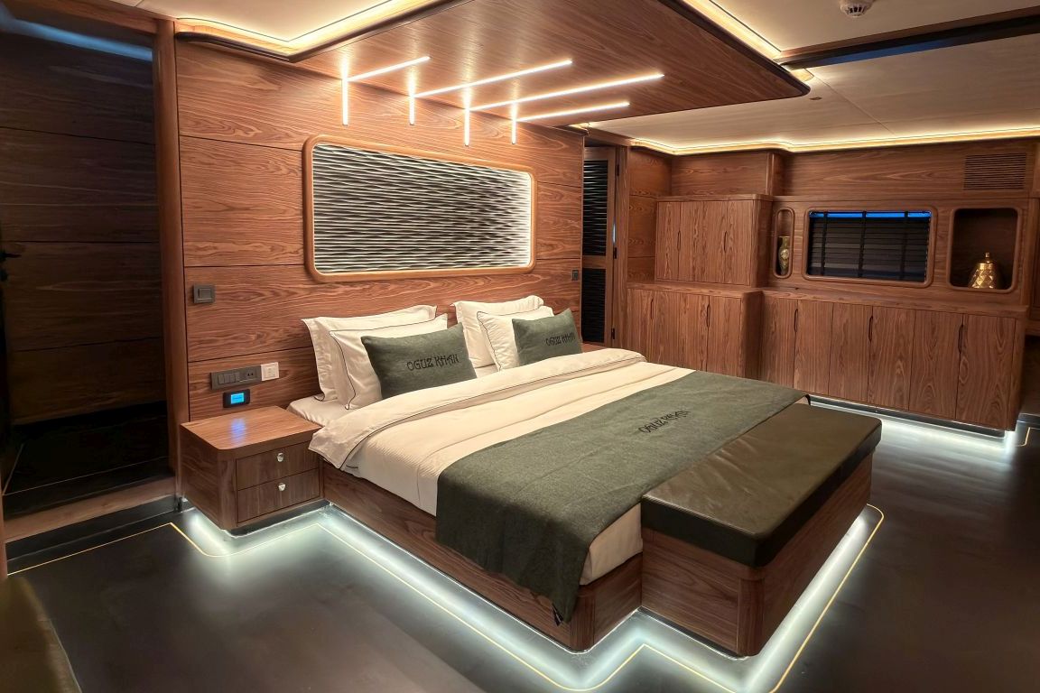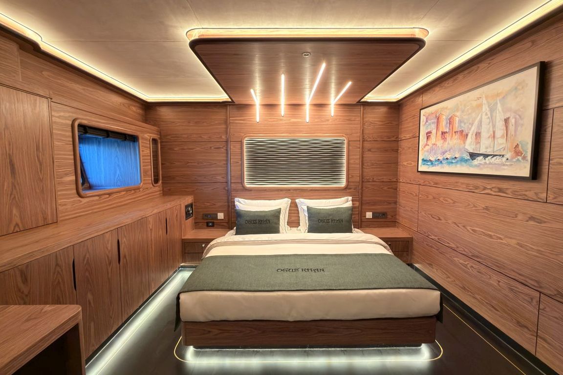 | 12 kişiye kadar konaklama imkanı; 1 Master Kabin, 4 Çift Kişilik Kabin, 1 iki yataklı kabin, tüm kabinlerde klima, gardırop, duş kabini ve ev tipi tuvaletler, ayrı mürettebat kabinleri. |