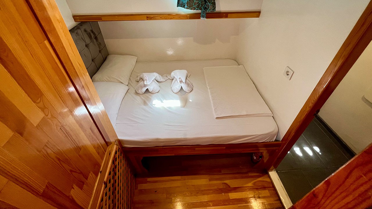 16 Kişiye Kadar Kapasite; 8 Çift Kişilik Kabin, tüm kabinlerde duş ve tuvalet, Ayrı mürettebat kabinleri.
