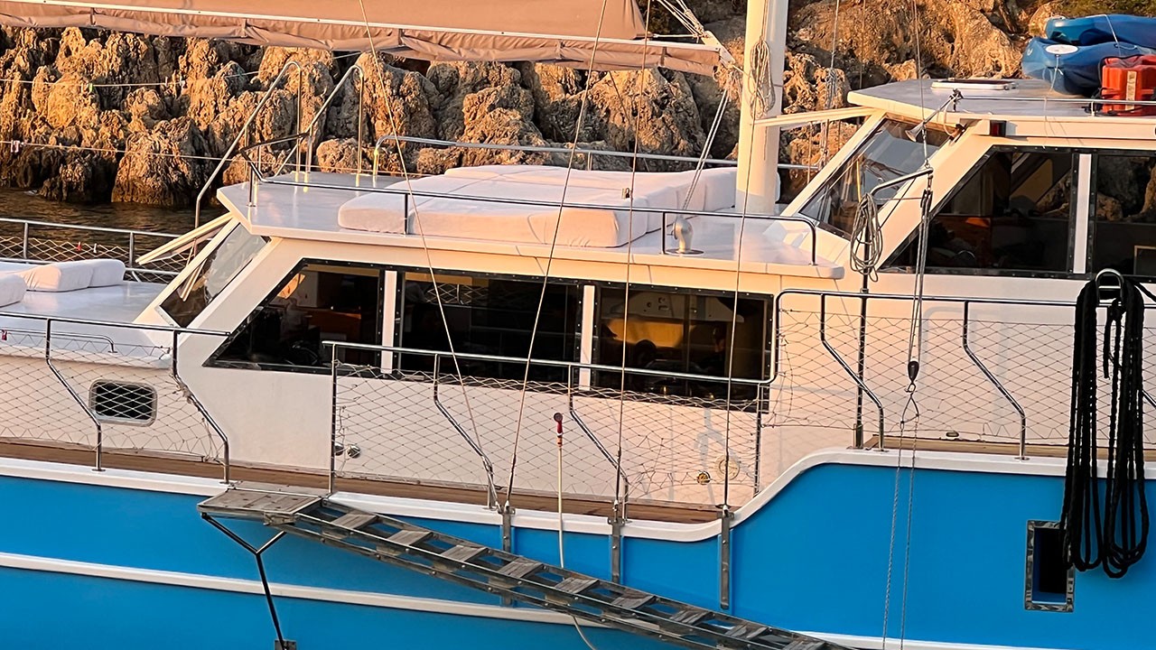 30 HP dıştan takma motorlu dingi, Stand Up Paddle Board, Kano, Şnorkelli yüzme ve balık tutma ekipmanları, Donanımlı mutfak, Güvenlik ekipmanları, Navigasyon ekipmanları, Yelken ekipmanları, Güneşlenme yatakları, Yemek alanı bulunan güverte, TV/DVD/CD oynatıcı, GPS, VHF radyo, Wi-fi internet