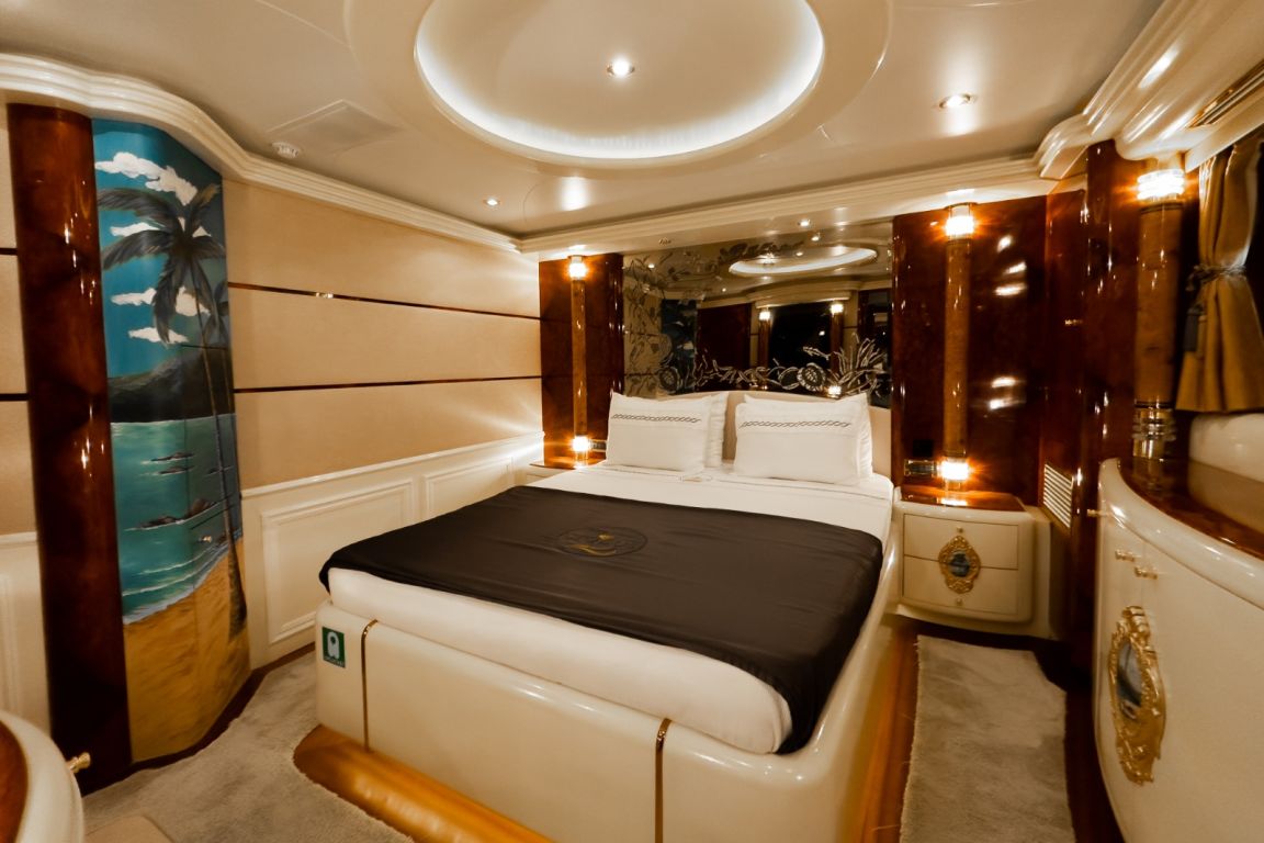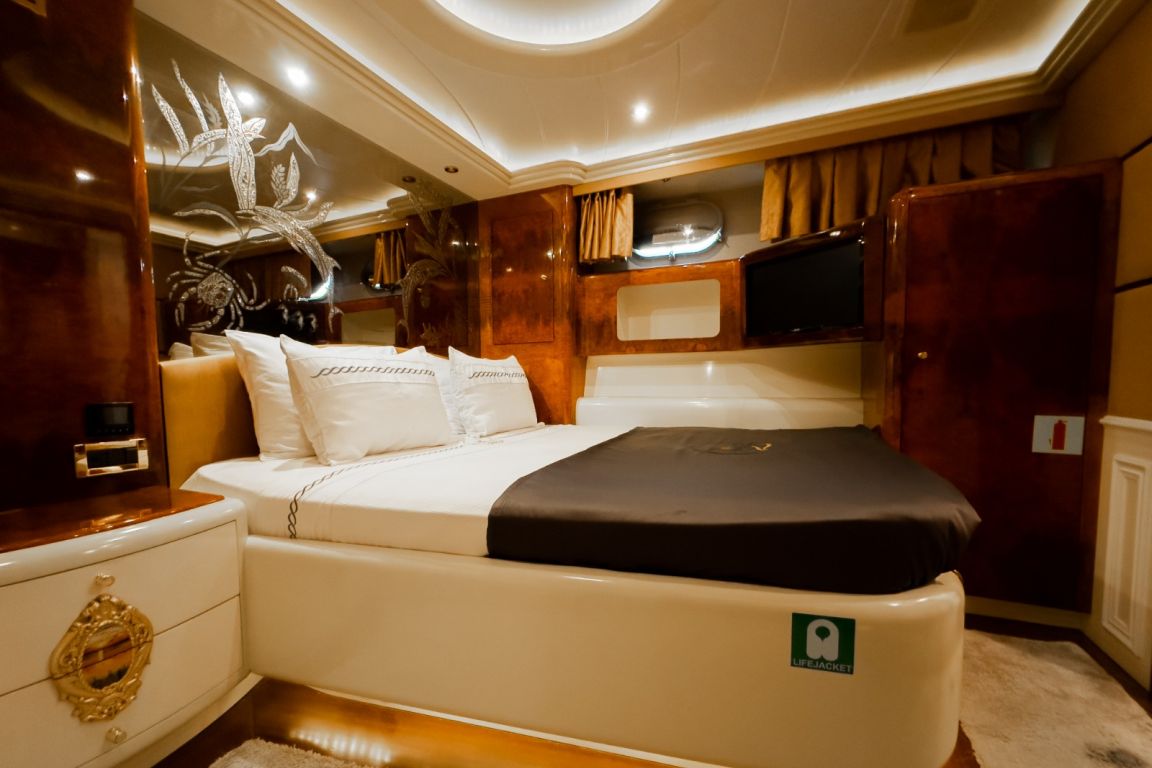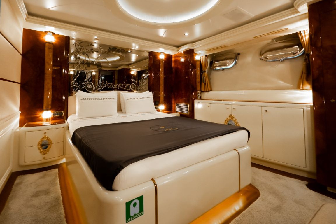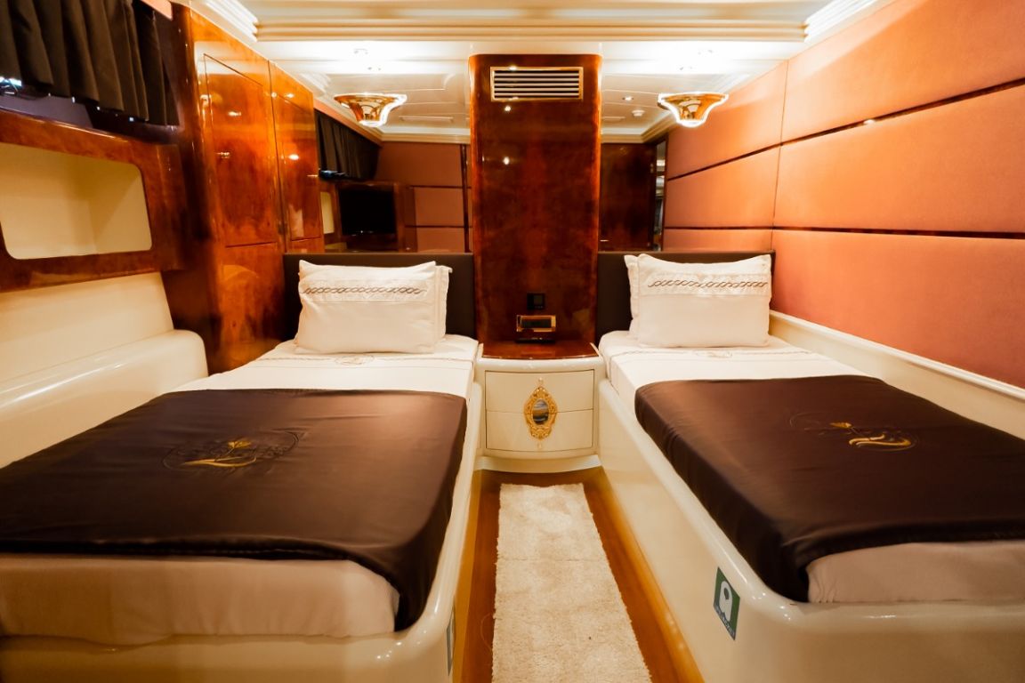 En fazla 12 misafir; 1 VIP, 1 Master, 3 Çift Kişilik, 1 İkiz Yataklı Kabin. Master Kabin: Alt güvertede bulunan geniş master kabinde king size yatak, Apple TV, internet erişimi ve Wi-Fi, çalışma/makyaj masası ve sinema ses sistemi bulunmaktadır. Kabinde ayrıca RGB ortam aydınlatması, klima, jakuzi, WC ve ayrı bir duş kabini de mevcuttur. VIP Kabin: VIP kabin ana güvertede yer almaktadır ve king size yatak, Apple TV, internet erişimi ve Wi-Fi, çalışma/makyaj masası ve sinema ses sistemi sunmaktadır. Misafirler RGB ortam aydınlatması, klima, jakuzi, WC ve özel duş kabininin keyfini çıkarabilirler. Çift Kişilik Kabinler (3): Alt güvertede üç adet konforlu çift kişilik kabin bulunmaktadır. Her kabinde queen size yatak, Apple TV, internet erişimi ve Wi-Fi, WC, duş kabini veya küvet ve klima bulunmaktadır. İkiz Kabin: Alt güvertede bulunan ikiz kabinde iki adet tek kişilik yatak, Apple TV, internet erişimi ve Wi-Fi, tuvalet, duş kabini ve klima bulunmaktadır. |