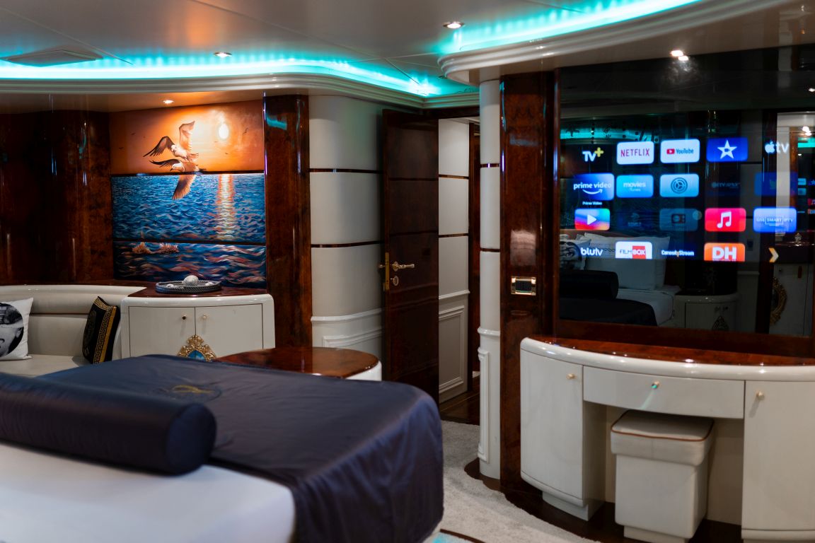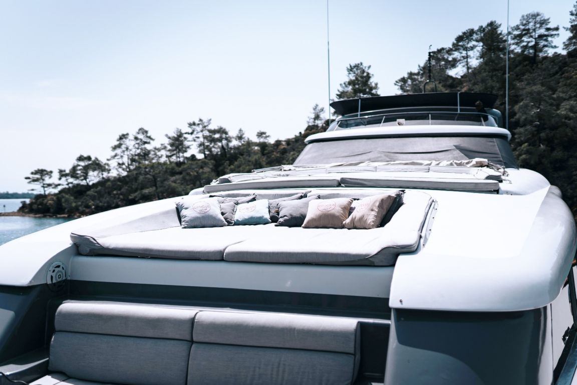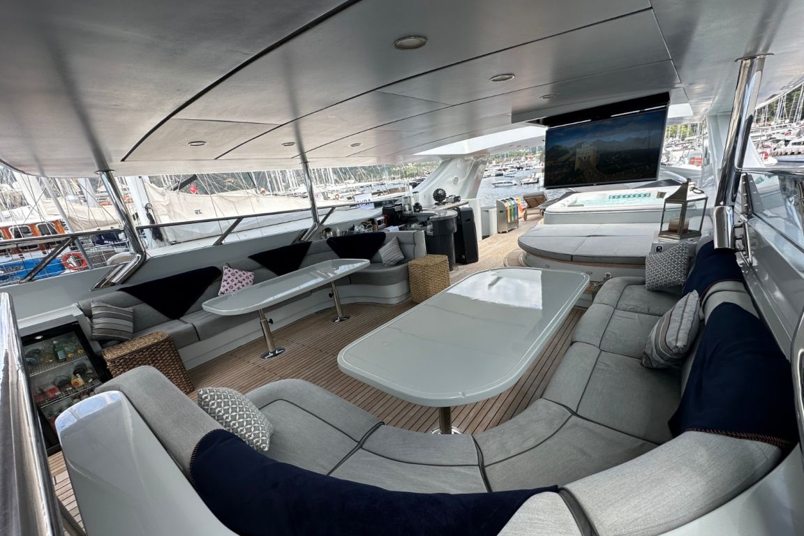 | TEKNE İÇİ ALANLAR; Salon (Ana Güverte), Zarif ana salonda koltuk altı soğutma sistemli konforlu deri kanepeler, yemek masası, klima ve RGB ortam aydınlatması bulunmaktadır. Eğlence seçenekleri arasında televizyon, Apple TV, internet erişimi, sinema ses sistemi ve iki adet 360 derece dönebilen TV yer almaktadır. Salon ayrıca maksimum konfor ve mahremiyet için otomatik perde sistemine sahiptir. Flybridge; Geniş flybridge, büyük bir güneşlenme alanı, barbekü alanı, televizyon, Apple TV, internet erişimi ve Wi-Fi sunmaktadır. Konuklar, gemi içi ses sistemi aracılığıyla müzik dinlerken ve akşamları RGB ortam aydınlatmasının keyfini çıkarırken açık deniz manzarasının tadını çıkarabilirler. TENDERLER VE SU OYUNCAKLARI; Tender: Zodiac Medline 6.00 - 115 HP, Su Kayağı, Wakeboard, Ringo (Çekilebilir Tüp), Paddleboard, Balıkçılık Ekipmanları, Kanolar, Banana Boat |