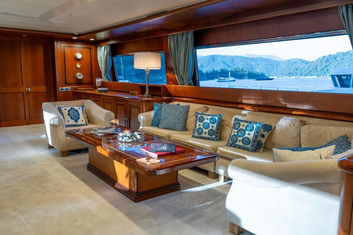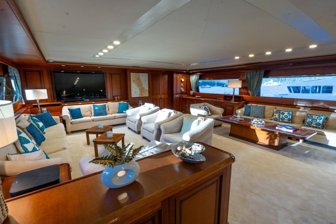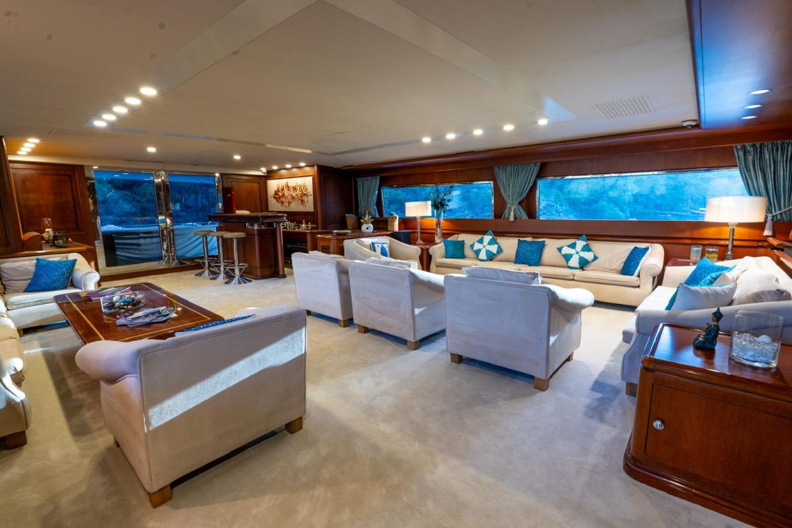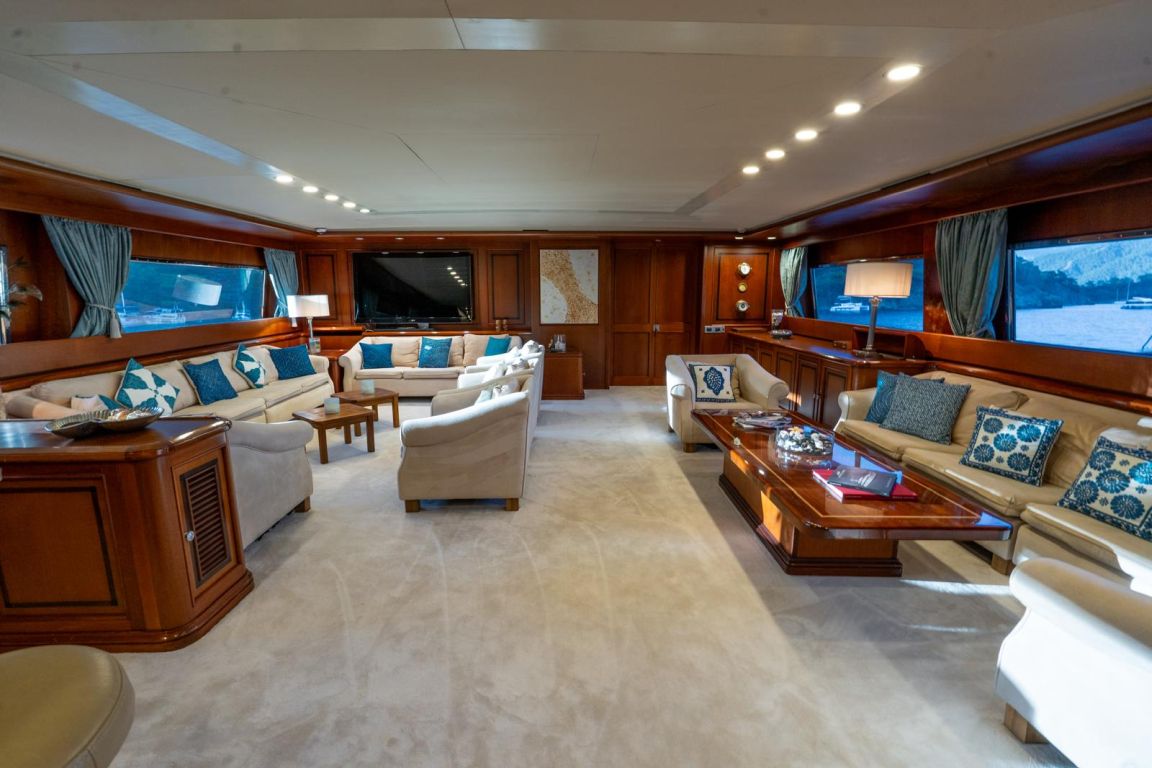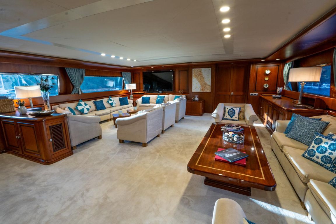 | GEMİ İÇİ ALANLAR; Salon (Ana Güverte); Şık ana salon, konforlu oturma alanları, bar, televizyon, Apple TV ve internet erişimi sunmaktadır. Eğlence seçenekleri arasında sinema ses sistemi, 3D sinema sistemi ve oyun konsolları bulunmaktadır. Salonda ayrıca klima ve dahili telefon sistemi de mevcuttur. Gökyüzü Salonu (Üst Güverte); Üst güverte gökyüzü salonu, yemek masası, ses sistemi, internet erişimi ve Wi-Fi, klima ve dahili telefon içeren konforlu bir oturma alanı sunmaktadır. Panoramik deniz manzarasının keyfini çıkarırken rahatlamak için mükemmel bir yerdir. Güneşlenme Güvertesi; Geniş güneşlenme güvertesi, büyük güneşlenme alanları, jakuzi ve havlu dolapları içermektedir. Konuklar, Akdeniz boyunca seyahat ederken muhteşem manzaraların ve rahatlatıcı anların tadını çıkarabilirler. TEKNELER VE SU OYUNCAKLARI; Botlar: Zodiac N-ZO 6.80 - 250 HP, Zodiac Medline 5.80 - 115 HP, Zodiac Yachtline 3.60 - 25 HP. Su Oyuncakları: Sea-Doo Jet Ski - 230 HP, ARGO Amfibik Araç, Hobie Cat Katamaran, Su Kayağı, Wakeboard, Ringo (Çekilebilir Tüp), Rüzgar Sörfü, Kürek Sörfü, Uçurtma Sörfü, Şişme Yüzme Platformu - 150 m2, Dalış Ekipmanları, Balıkçılık Ekipmanları |