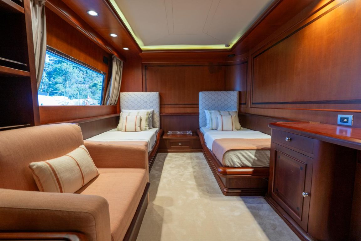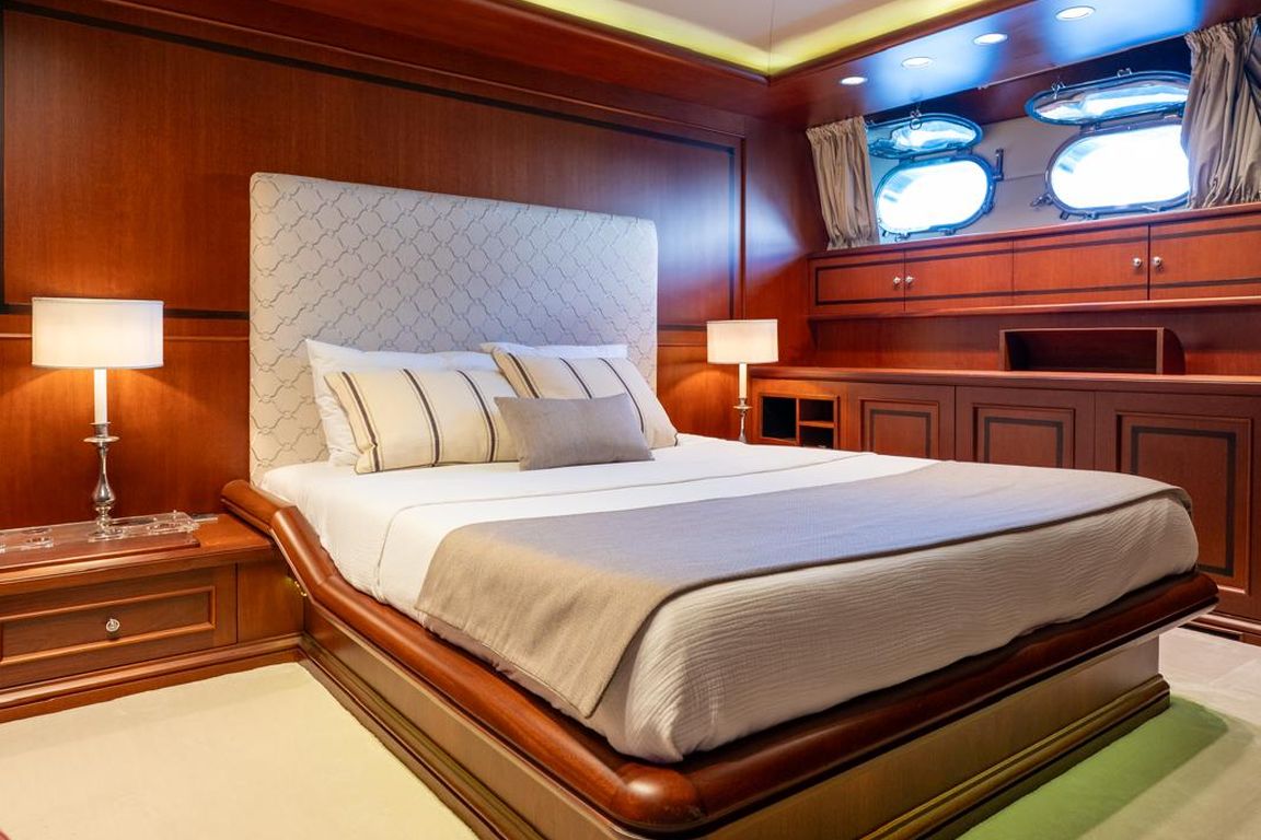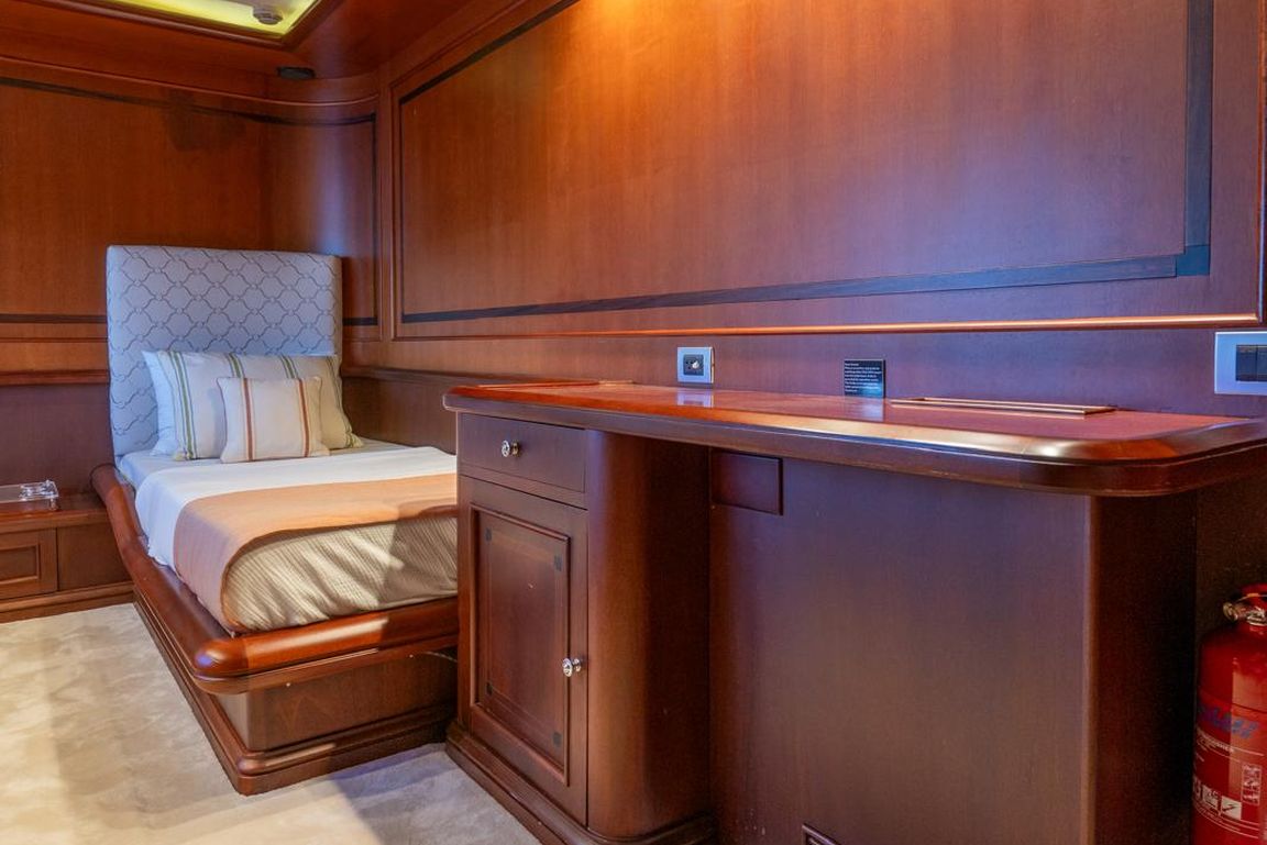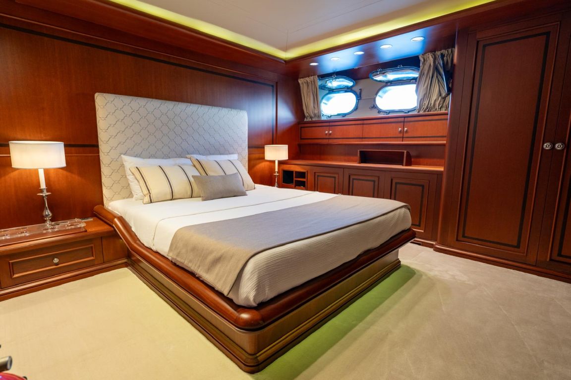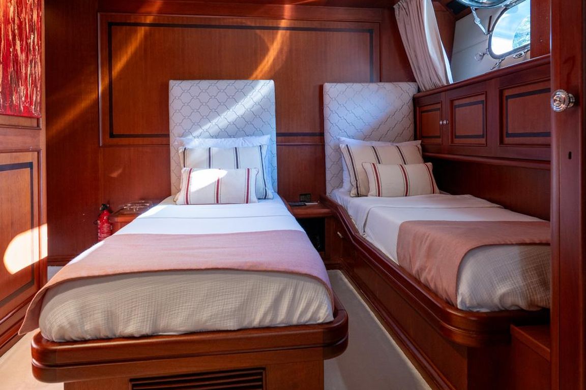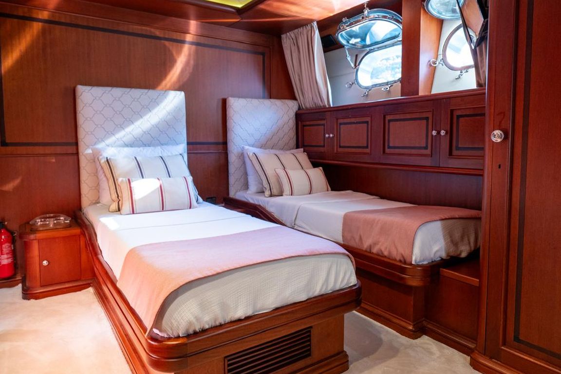 12 Kişiye Kadar; 1 VIP, 3 Çift Kişilik, 2 İkiz Yataklı Kabin. VIP Kabin (Ana Güverte); Geniş VIP kabinde king size yatak, Apple TV, internet erişimi ve Wi-Fi, çalışma/makyaj masası ve dahili telefon bulunmaktadır. Kabinde ayrıca kitaplık, WC ve bide, jakuzi, duş kabini ve klima mevcuttur. 3 Çift Kişilik Kabin (Alt Güverte); Kraliçe boy yataklı üç şık çift kişilik kabin. Her kabinde Apple TV, internet erişimi ve Wi-Fi, dahili telefon, WC ve bide, jakuzi ve klima bulunmaktadır. İkiz Yataklı Kabin (Ana Güverte); İki tek kişilik yataklı ikiz kabin, Apple TV, internet erişimi ve Wi-Fi, çalışma/makyaj masası, dahili telefon, kitaplık, WC ve bide, jakuzi ve klima mevcuttur. İki Kişilik Kabin (Alt Güverte); İki adet tek kişilik yatak, Apple TV, internet erişimi ve Wi-Fi, dahili telefon, WC ve bide, duş kabini ve klima bulunan iki kişilik kabin. |